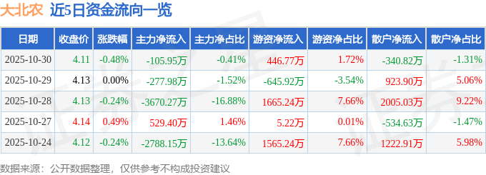 证券之星消息,截至2025年10月30日收盘,大北农(002385)报收于4.11元,下跌0.48%,换手率1.79%,成交量62.96万手,成交额2.6亿元。