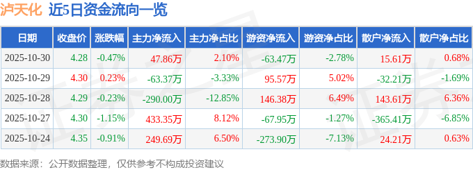 10月30日的资金流向数据方面,主力资金净流入47.86万元,占总成交额2.1%,游资资金净流出63.47万元,占总成交额2.78%,散户资金净流入15.61万元,占总成交额0.68%。