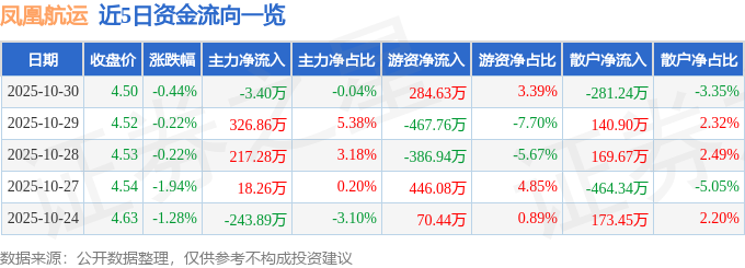 证券之星消息,截至2025年10月30日收盘,凤凰航运(000520)报收于4.5元,下跌0.44%,换手率1.82%,成交量18.42万手,成交额8404.55万元。