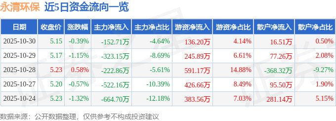 证券之星消息,截至2025年10月30日收盘,永清环保(300187)报收于5.15元,下跌0.39%,换手率0.99%,成交量6.37万手,成交额3288.88万元。