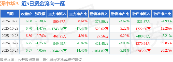 证券之星消息,截至2025年10月30日收盘,深中华A(000017)报收于6.68元,下跌0.3%,换手率5.12%,成交量15.52万手,成交额1.05亿元。