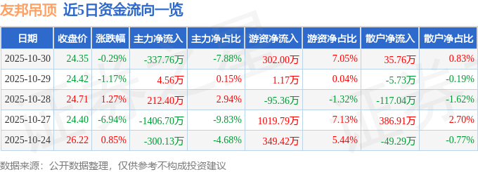 证券之星消息,截至2025年10月30日收盘,友邦吊顶(002718)报收于24.35元,下跌0.29%,换手率3.1%,成交量1.75万手,成交额4286.48万元。