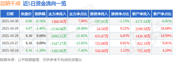 证券之星消息,截至2025年10月30日收盘,百纳千成(300291)报收于6.06元,下跌0.16%,换手率3.06%,成交量28.46万手,成交额1.72亿元。