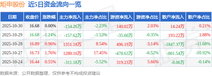 证券之星消息,截至2025年10月30日收盘,炬申股份(001202)报收于16.68元,上涨0.0%,换手率3.55%,成交量4.15万手,成交额6912.85万元。