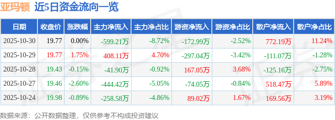 10月30日的资金流向数据方面,主力资金净流出599.21万元,占总成交额8.72%,游资资金净流出172.99万元,占总成交额2.52%,散户资金净流入772.19万元,占总成交额11.24%。