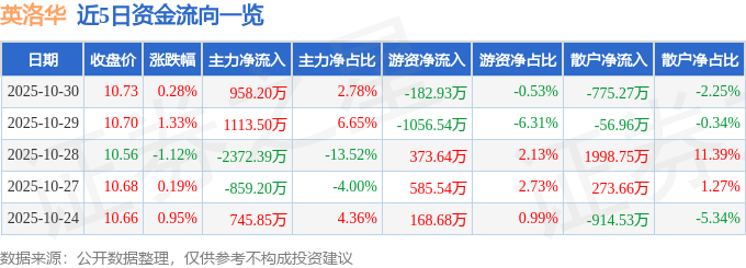10月30日的资金流向数据方面,主力资金净流入958.2万元,占总成交额2.78%,游资资金净流出182.93万元,占总成交额0.53%,散户资金净流出775.27万元,占总成交额2.25%。