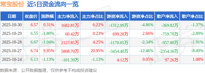 证券之星消息,截至2025年10月30日收盘,常宝股份(002478)报收于6.57元,上涨0.31%,换手率5.65%,成交量40.81万手,成交额2.7亿元。