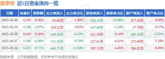 证券之星消息,截至2025年10月30日收盘,嘉事堂(002462)报收于13.93元,上涨0.36%,换手率1.36%,成交量3.97万手,成交额5547.55万元。