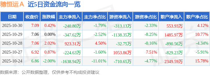 证券之星消息,截至2025年10月30日收盘,穗恒运A(000531)报收于7.09元,上涨0.42%,换手率2.09%,成交量19.03万手,成交额1.34亿元。