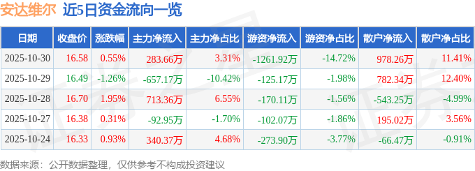 证券之星消息,截至2025年10月30日收盘,安达维尔(300719)报收于16.58元,上涨0.55%,换手率2.87%,成交量5.15万手,成交额8571.86万元。