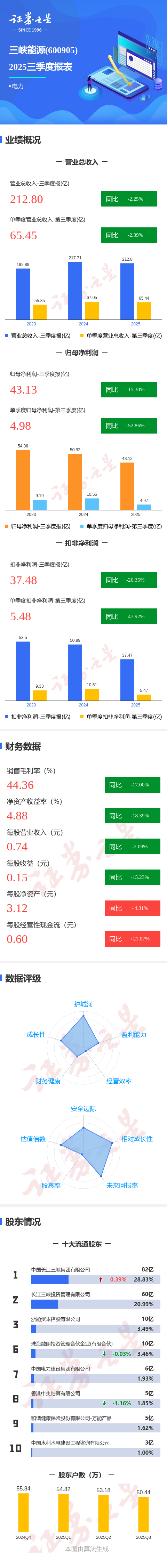 证券之星消息,三峡能源2025年三季报显示,前三季度公司主营收入212.8亿元,同比下降2.26%;归母净利润43.13亿元,同比下降15.31%;扣非净利润37.48亿元,同比下降26.36%;其中2025年第三季度,公司单季度主营收入65.45亿元,同比下降2.4%;单季度归母净利润4.98亿元,同比下降52.87%;单季度扣非净利润5.48亿元,同比下降47.93%;负债率71.25%,投资收益9.69亿元,财务费用31.01亿元,毛利率44.36%。