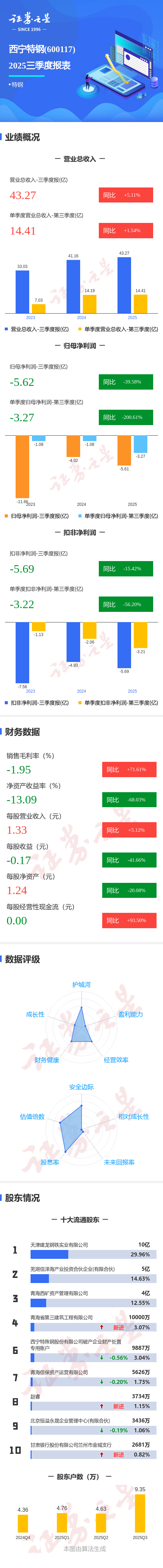 证券之星消息,西宁特钢2025年三季报显示,前三季度公司主营收入43.27亿元,同比上升5.12%;归母净利润-5.62亿元,同比下降39.58%;扣非净利润-5.69亿元,同比下降15.43%;其中2025年第三季度,公司单季度主营收入14.41亿元,同比上升1.55%;单季度归母净利润-3.27亿元,同比下降200.61%;单季度扣非净利润-3.22亿元,同比下降56.21%;负债率53.81%,投资收益-337.19万元,财务费用1.18亿元,毛利率-1.95%。