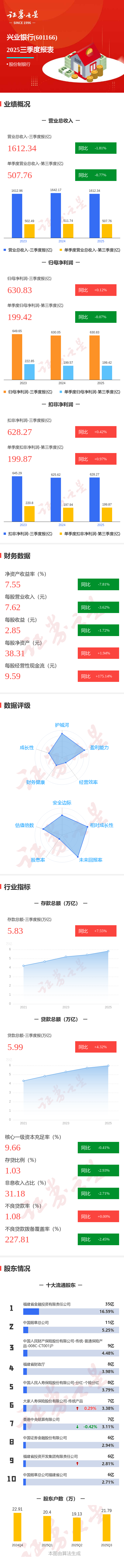 证券之星消息,兴业银行2025年三季报显示,前三季度公司主营收入1612.34亿元,同比下降1.82%;归母净利润630.83亿元,同比上升0.12%;扣非净利润628.27亿元,同比上升0.42%;其中2025年第三季度,公司单季度主营收入507.76亿元,同比下降0.78%;单季度归母净利润199.42亿元,同比下降0.08%;单季度扣非净利润199.87亿元,同比上升0.98%;负债率91.54%,投资收益268.82亿元。