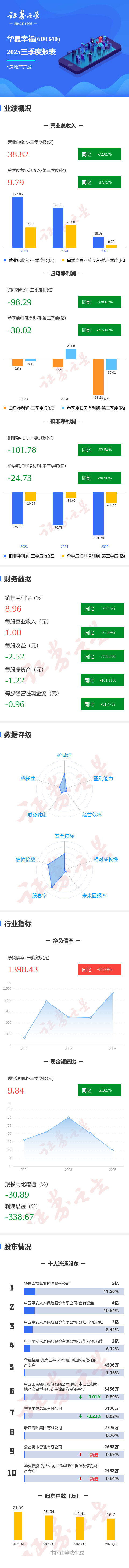 证券之星消息,华夏幸福2025年三季报显示,前三季度公司主营收入38.82亿元,同比下降72.09%;归母净利润-98.29亿元,同比下降338.67%;扣非净利润-101.78亿元,同比下降32.55%;其中2025年第三季度,公司单季度主营收入9.79亿元,同比下降87.76%;单季度归母净利润-30.02亿元,同比下降215.06%;单季度扣非净利润-24.73亿元,同比下降80.99%;负债率96.44%,投资收益13.32亿元,财务费用69.16亿元,毛利率8.96%。