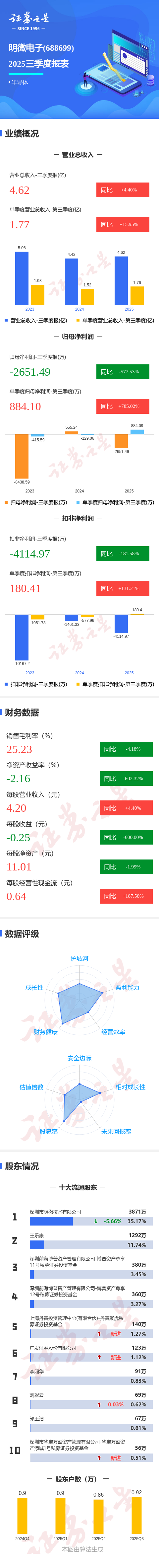 证券之星消息,明微电子2025年三季报显示,前三季度公司主营收入4.62亿元,同比上升4.41%;归母净利润-2651.49万元,同比下降577.53%;扣非净利润-4114.97万元,同比下降181.59%;其中2025年第三季度,公司单季度主营收入1.77亿元,同比上升15.96%;单季度归母净利润884.1万元,同比上升785.02%;单季度扣非净利润180.41万元,同比上升131.21%;负债率21.01%,投资收益987.7万元,财务费用149.02万元,毛利率25.23%。