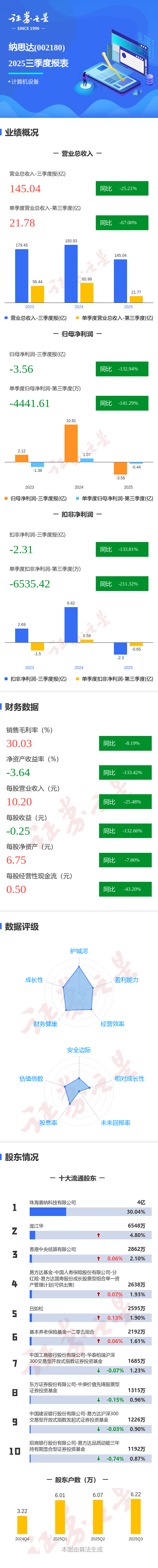 证券之星消息,纳思达2025年三季报显示,前三季度公司主营收入145.04亿元,同比下降25.21%;归母净利润-3.56亿元,同比下降132.94%;扣非净利润-2.31亿元,同比下降133.81%;其中2025年第三季度,公司单季度主营收入21.78亿元,同比下降67.0%;单季度归母净利润-4441.61万元,同比下降141.29%;单季度扣非净利润-6535.42万元,同比下降211.33%;负债率44.35%,投资收益874.5万元,财务费用4.77亿元,毛利率30.03%。