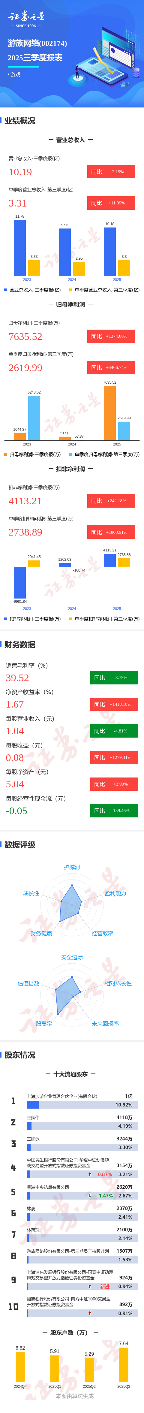 证券之星消息,游族网络2025年三季报显示,前三季度公司主营收入10.19亿元,同比上升2.2%;归母净利润7635.52万元,同比上升1374.6%;扣非净利润4113.21万元,同比上升242.19%;其中2025年第三季度,公司单季度主营收入3.31亿元,同比上升11.99%;单季度归母净利润2619.99万元,同比上升4466.74%;单季度扣非净利润2738.89万元,同比上升1803.92%;负债率14.19%,投资收益2183.94万元,财务费用1191.37万元,毛利率39.52%。