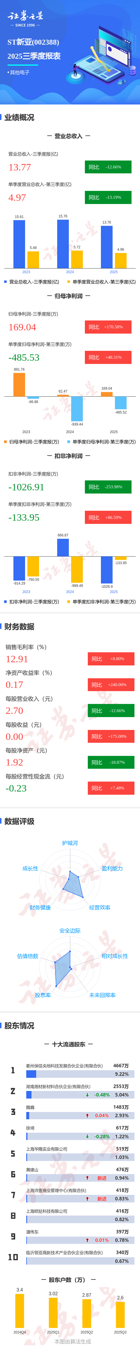 证券之星消息,ST新亚2025年三季报显示,前三季度公司主营收入13.77亿元,同比下降12.66%;归母净利润169.04万元,同比上升170.58%;扣非净利润-1026.91万元,同比下降253.99%;其中2025年第三季度,公司单季度主营收入4.97亿元,同比下降13.2%;单季度归母净利润-485.53万元,同比上升48.32%;单季度扣非净利润-133.95万元,同比上升86.6%;负债率57.03%,投资收益2995.88万元,财务费用3942.3万元,毛利率12.91%。