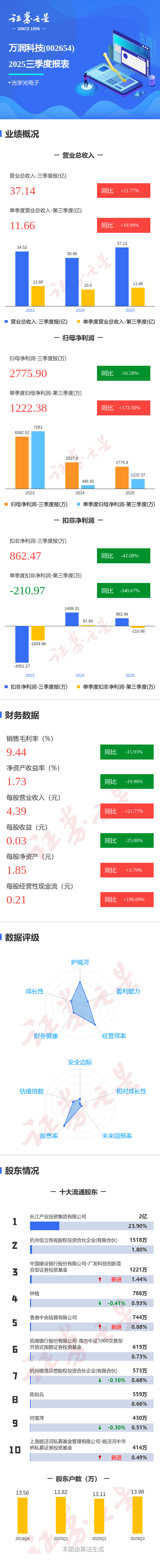 证券之星消息,万润科技2025年三季报显示,前三季度公司主营收入37.14亿元,同比上升21.77%;归母净利润2775.9万元,同比下降16.58%;扣非净利润862.47万元,同比下降42.09%;其中2025年第三季度,公司单季度主营收入11.66亿元,同比上升11.0%;单季度归母净利润1222.38万元,同比上升173.51%;单季度扣非净利润-210.97万元,同比下降340.68%;负债率65.32%,投资收益130.0万元,财务费用5444.37万元,毛利率9.44%。