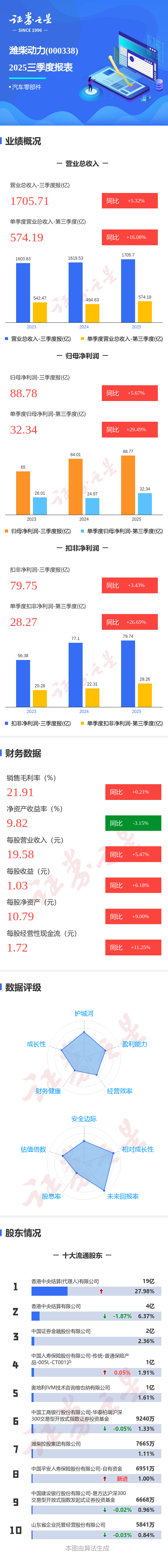 证券之星消息,潍柴动力2025年三季报显示,前三季度公司主营收入1705.71亿元,同比上升5.32%;归母净利润88.78亿元,同比上升5.67%;扣非净利润79.75亿元,同比上升3.43%;其中2025年第三季度,公司单季度主营收入574.19亿元,同比上升16.08%;单季度归母净利润32.34亿元,同比上升29.49%;单季度扣非净利润28.27亿元,同比上升26.69%;负债率63.87%,投资收益3.01亿元,财务费用-5.93亿元,毛利率21.91%。
