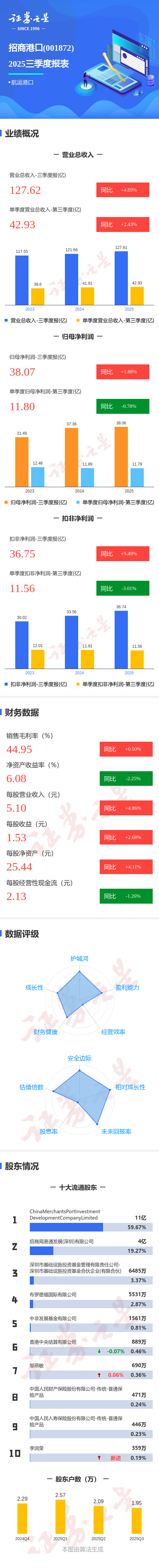 证券之星消息,招商港口2025年三季报显示,前三季度公司主营收入127.62亿元,同比上升4.89%;归母净利润38.07亿元,同比上升1.89%;扣非净利润36.75亿元,同比上升9.49%;其中2025年第三季度,公司单季度主营收入42.93亿元,同比上升2.44%;单季度归母净利润11.8亿元,同比下降0.78%;单季度扣非净利润11.56亿元,同比下降3.01%;负债率35.02%,投资收益52.23亿元,财务费用10.99亿元,毛利率44.95%。