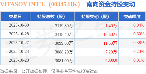 证券之星消息,10月30日南向资金增持1.4万股VITASOY INT'L(00345.HK)。近5个交易日中,获南向资金增持的有5天,累计净增持39.2万股。近20个交易日中,获南向资金增持的有19天,累计净增持196.6万股。截至目前,南向资金持有VITASOY INT'L(00345.HK)3119.8万股,占公司已发行普通股的2.97%。