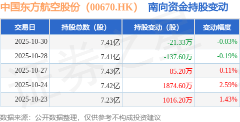 证券之星消息,10月30日南向资金减持21.33万股中国东方航空股份(00670.HK)。近5个交易日中,获南向资金增持的有3天,累计净增持2817.07万股。近20个交易日中,获南向资金增持的有16天,累计净增持1.24亿股。截至目前,南向资金持有中国东方航空股份(00670.HK)7.41亿股,占公司已发行普通股的14.3%。