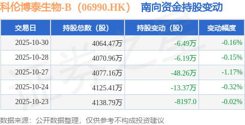 证券之星消息,10月30日南向资金减持6.49万股科伦博泰生物-B(06990.HK)。近5个交易日中,获南向资金减持的有5天,累计净减持75.14万股。近20个交易日中,获南向资金减持的有14天,累计净减持166.84万股。截至目前,南向资金持有科伦博泰生物-B(06990.HK)4064.47万股,占公司已发行普通股的24.96%。