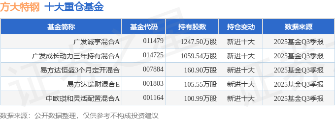 持有方大特钢最多的基金为广发诚享混合A,目前规模为15.27亿元,最新净值0.5214(10月29日),较上一交易日上涨2.72%,近一年下跌3.62%。该基金现任基金经理为郑澄然 观富钦 叶帅。
