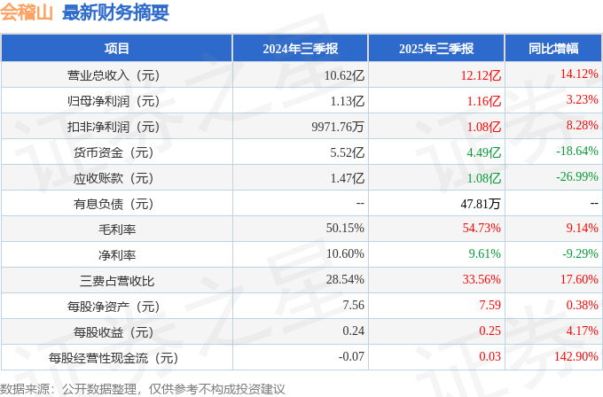 据证券之星公开数据整理,近期会稽山(601579)发布2025年三季报。根据财报显示,会稽山营收净利润同比双双增长。截至本报告期末,公司营业总收入12.12亿元,同比上升14.12%,归母净利润1.16亿元,同比上升3.23%。按单季度数据看,第三季度营业总收入3.95亿元,同比上升21.09%,第三季度归母净利润2239.08万元,同比上升2.47%。