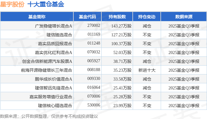 持有星宇股份最多的基金为广发稳健增长混合A,目前规模为101.66亿元,最新净值1.6462(10月30日),较上一交易日下跌0.43%,近一年上涨10.89%。该基金现任基金经理为傅友兴 周智硕。