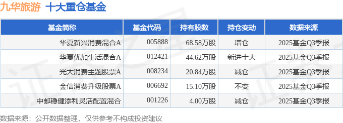 持有九华旅游最多的基金为华夏新兴消费混合A,目前规模为4.53亿元,最新净值2.1194(10月29日),较上一交易日下跌0.07%,近一年下跌1.32%。该基金现任基金经理为孙轶佳。