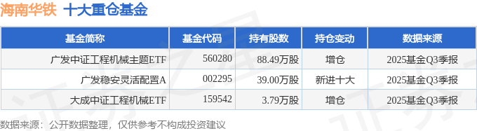 持有海南华铁最多的基金为广发中证工程机械主题ETF,目前规模为3.51亿元,最新净值1.5245(10月30日),较上一交易日上涨0.05%,近一年上涨31.64%。该基金现任基金经理为姚曦。