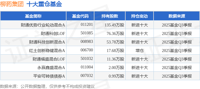 持有柳药集团最多的基金为财通优势行业轮动混合A,目前规模为5.63亿元,最新净值0.7276(10月30日),较上一交易日下跌1.58%,近一年上涨13.95%。该基金现任基金经理为张胤。