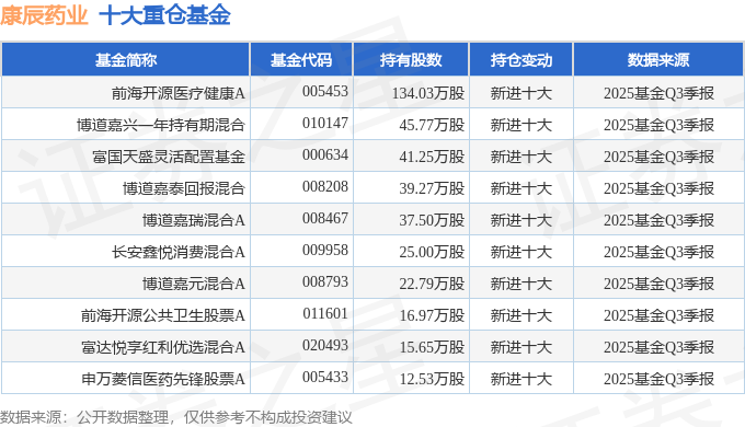 持有康辰药业最多的基金为前海开源医疗健康A,目前规模为5.46亿元,最新净值1.2692(10月29日),较上一交易日上涨2.08%,近一年上涨38.97%。该基金现任基金经理为范洁。