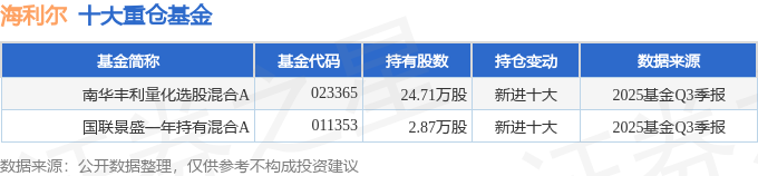 持有海利尔最多的基金为南华丰利量化选股混合A,目前规模为0.38亿元,最新净值1.1239(10月30日),较上一交易日下跌1.03%。该基金现任基金经理为黄志钢 康冬。