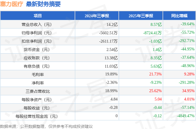 据证券之星公开数据整理,近期塞力医疗(603716)发布2025年三季报。截至本报告期末,公司营业总收入8.57亿元,同比下降39.64%,归母净利润-8724.41万元,同比下降55.72%。按单季度数据看,第三季度营业总收入2.74亿元,同比下降38.41%,第三季度归母净利润-3112.49万元,同比上升39.27%。本报告期塞力医疗三费占比上升明显,财务费用、销售费用和管理费用总和占总营收同比增幅达34.95%。