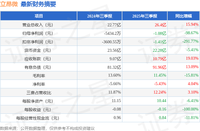 据证券之星公开数据整理,近期立昂微(605358)发布2025年三季报。根据财报显示,立昂微增收不增利。截至本报告期末,公司营业总收入26.4亿元,同比上升15.94%,归母净利润-1.08亿元,同比下降98.67%。按单季度数据看,第三季度营业总收入9.74亿元,同比上升19.09%,第三季度归母净利润1906.47万元,同比上升52.34%。