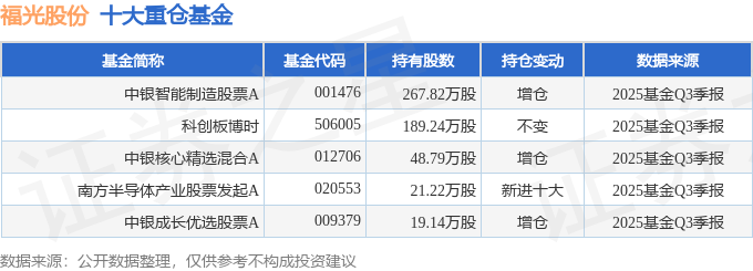 持有福光股份最多的基金为中银智能制造股票A,目前规模为12.03亿元,最新净值2.554(10月30日),较上一交易日下跌2.41%,近一年上涨49.29%。该基金现任基金经理为周斌。