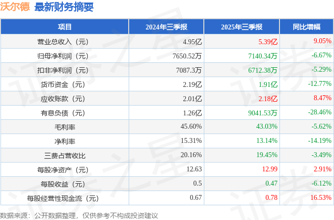 据证券之星公开数据整理,近期沃尔德(688028)发布2025年三季报。截至本报告期末,公司营业总收入5.39亿元,同比上升9.05%,归母净利润7140.34万元,同比下降6.67%。按单季度数据看,第三季度营业总收入2.04亿元,同比上升14.27%,第三季度归母净利润2778.08万元,同比上升24.76%。本报告期沃尔德公司应收账款体量较大,当期应收账款占最新年报归母净利润比达220.23%。