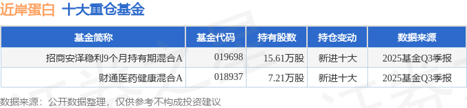 持有近岸蛋白最多的基金为招商安泽稳利9个月持有期混合A,目前规模为5.16亿元,最新净值1.2058(10月30日),较上一交易日下跌0.06%,近一年上涨12.74%。该基金现任基金经理为滕越 王娟娟。