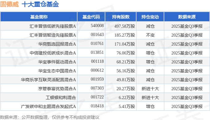 持有固德威最多的基金为汇丰晋信低碳先锋股票A,目前规模为36.77亿元,最新净值3.0222(10月30日),较上一交易日上涨0.21%,近一年上涨22.49%。该基金现任基金经理为陆彬。