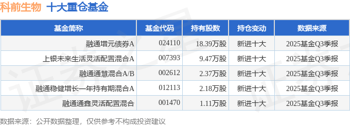 持有科前生物最多的基金为融通增元债券A,目前规模为3.03亿元,最新净值1.0155(10月30日),较上一交易日下跌0.28%。该基金现任基金经理为余志勇 张彩婷。