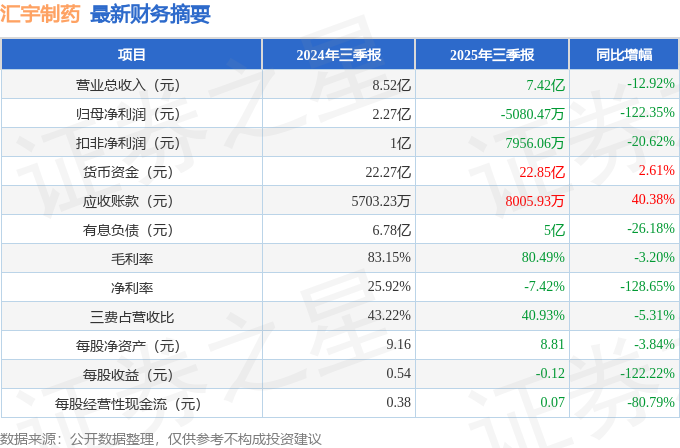 据证券之星公开数据整理,近期汇宇制药(688553)发布2025年三季报。根据财报显示,汇宇制药净利润同比下降122.35%。截至本报告期末,公司营业总收入7.42亿元,同比下降12.92%,归母净利润-5080.47万元,同比下降122.35%。按单季度数据看,第三季度营业总收入2.89亿元,同比下降9.7%,第三季度归母净利润2991.58万元,同比下降81.55%。