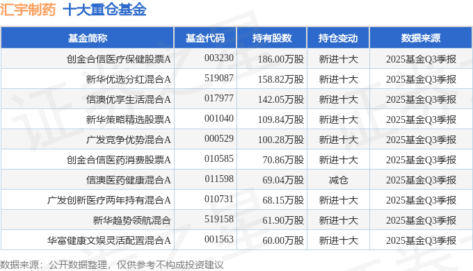 持有汇宇制药最多的基金为创金合信医疗保健股票A,目前规模为1.92亿元,最新净值2.0228(10月29日),较上一交易日下跌1.24%,近一年上涨22.58%。该基金现任基金经理为皮劲松。