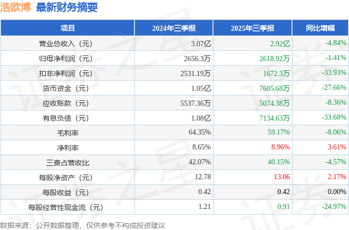 据证券之星公开数据整理,近期浩欧博(688656)发布2025年三季报。截至本报告期末,公司营业总收入2.92亿元,同比下降4.84%,归母净利润2618.92万元,同比下降1.41%。按单季度数据看,第三季度营业总收入1.03亿元,同比下降1.64%,第三季度归母净利润1402.0万元,同比上升113.01%。本报告期浩欧博公司应收账款体量较大,当期应收账款占最新年报归母净利润比达137.88%。