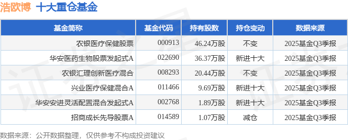 持有浩欧博最多的基金为农银医疗保健股票,目前规模为14.87亿元,最新净值1.6737(10月30日),较上一交易日下跌1.7%,近一年上涨15.47%。该基金现任基金经理为梦圆。