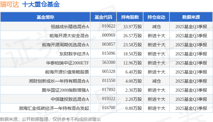 持有瑞可达最多的基金为恒越成长精选混合A,目前规模为4.73亿元,最新净值0.895(10月29日),较上一交易日上涨1.49%,近一年上涨58.69%。该基金现任基金经理为廖明兵。