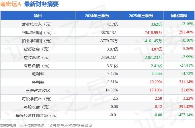 据证券之星公开数据整理,近期粤宏远A(000573)发布2025年三季报。根据财报显示,粤宏远A净利润同比增长291.4%。截至本报告期末,公司营业总收入3.62亿元,同比下降13.16%,归母净利润7418.99万元,同比上升291.4%。按单季度数据看,第三季度营业总收入1.21亿元,同比下降24.16%,第三季度归母净利润-2705.09万元,同比上升15.64%。