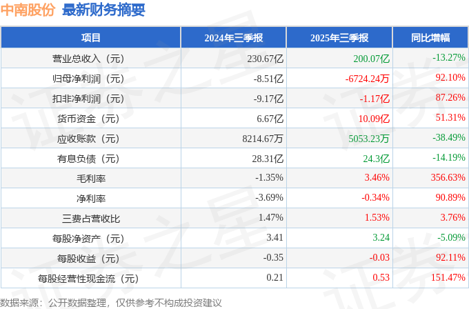 据证券之星公开数据整理,近期中南股份(000717)发布2025年三季报。截至本报告期末,公司营业总收入200.07亿元,同比下降13.27%,归母净利润-6724.24万元,同比上升92.1%。按单季度数据看,第三季度营业总收入71.81亿元,同比上升5.81%,第三季度归母净利润-7253.29万元,同比上升81.95%。本报告期中南股份盈利能力上升,毛利率同比增幅356.63%,净利率同比增幅90.89%。
